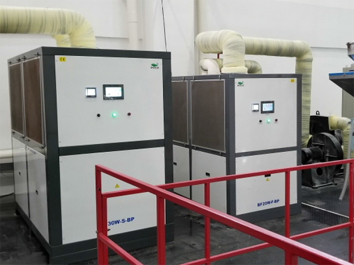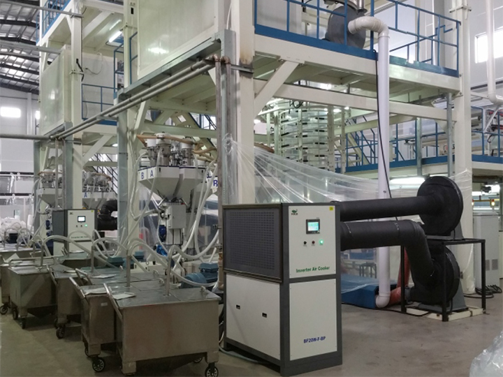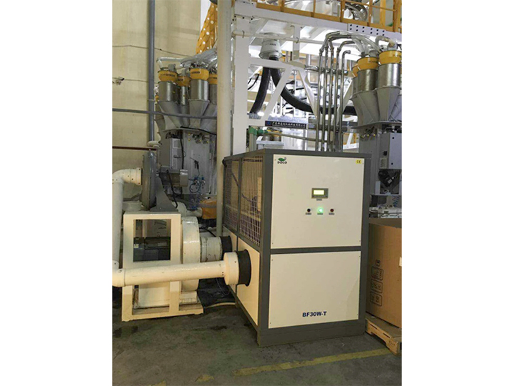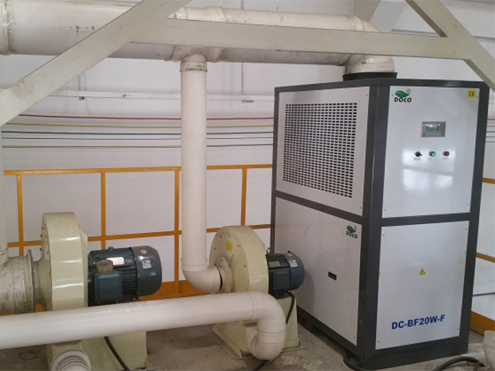 Doco Film Chiller is specially designed for cooling plastic film blowing machine. The working principle is as follows: The chiller refrigerates through the compressor, the indoor ambient air should be cooled from 40-45 ℃ to 10-15℃ through the built-in high efficiency copper tube heat exchanger, and then high-pressure centrifugal blower sends low-temperature air to the inner and outer air rings of the film blowing machine through air duct in order to cooling the film bubble which has just been blown out from the die head, the film bubble can be cooled quickly, all which improves the thickness uniformity of the film, increases the transparency and brightness, accelerates the film setting, enhances the film physical properties and increases output by more than 20-30%.